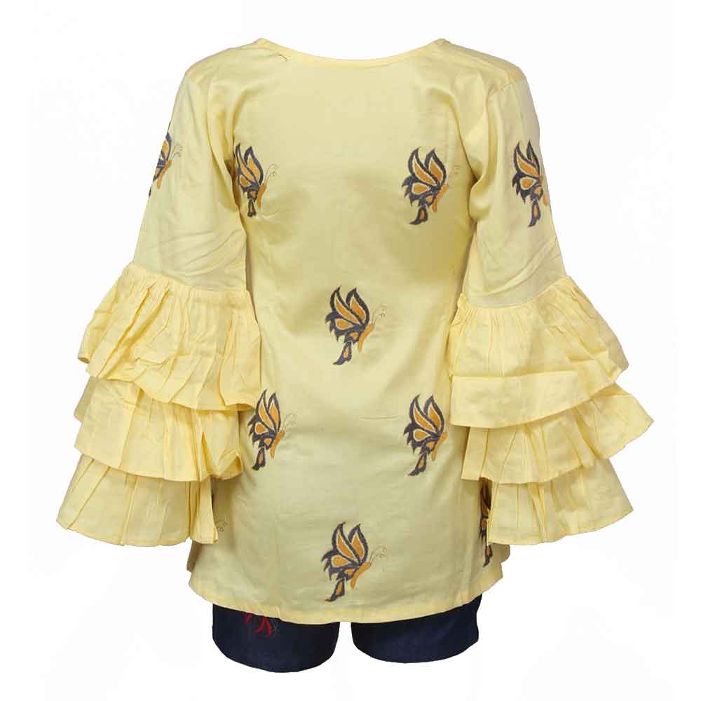 Top Is Of Yellow Colour With Brown & Saffron Butterfly Embroidery.