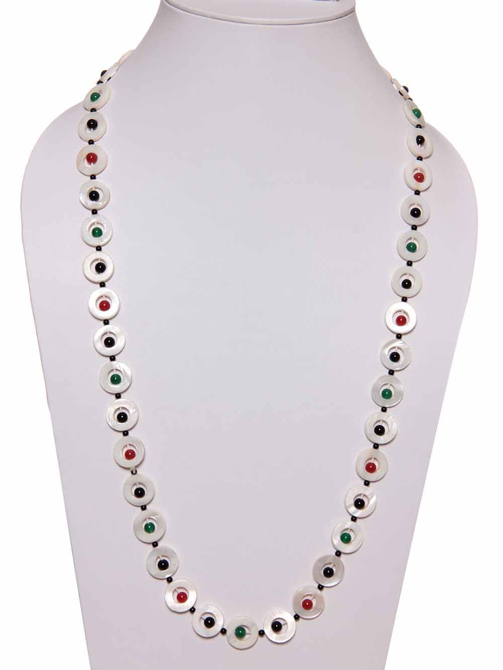 Beautiful & Genuine Black Green Red Onyx And Mother Of Pearl Necklace. Good Quality Semi Precious Gemstone. It Is A Joyful Stone That Feels Very Secure In Its Essence And Transmits The Same Warmth, Protection And Inner Security To Its Surroundings. Handcrafted Fine Onyx Crystal Semi Precious Gemstone Necklace Is Stunning With The Any Dress. Onyx Gemstone Looks Unique In Style. It Complements Your Outfits. Light Weight Necklace Suited For Any Dress And Age. Shape Of Stone:Plain Round Bead, Mother Of Pearl Coin, Size Of Bead: 4mm To 6mm, Length: Approx 37″, Weight 86 Grams
