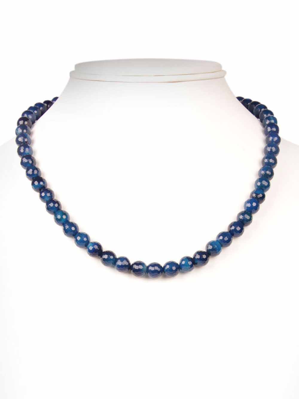 Handcrafted Fine Blue Onyx Crystal Semi Precious Gemstone Necklace is stunning with the any dress. Onyx Gemstone looks unique in style. It complements your outfits. Light weight Neclklace suited for any dress and age. Size of Bead: 8mm, Length: Approx 17″, Shape of Stone: Faceted round bead.