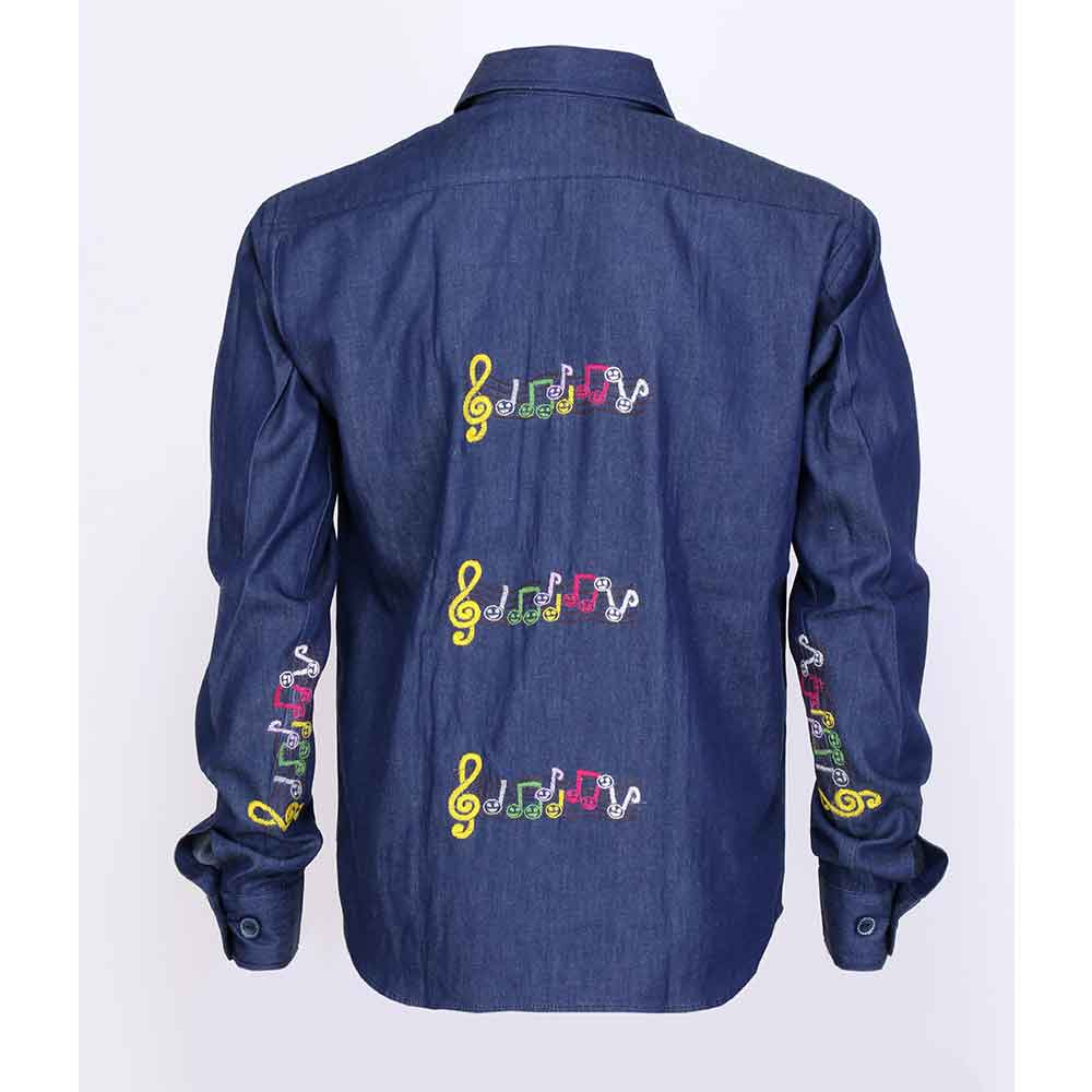 Full Sleeve Collared Soft Deep Blue Denim Shirt With Kantha Embroidery Done.the Shirt Depicts The Various Notes Of Music