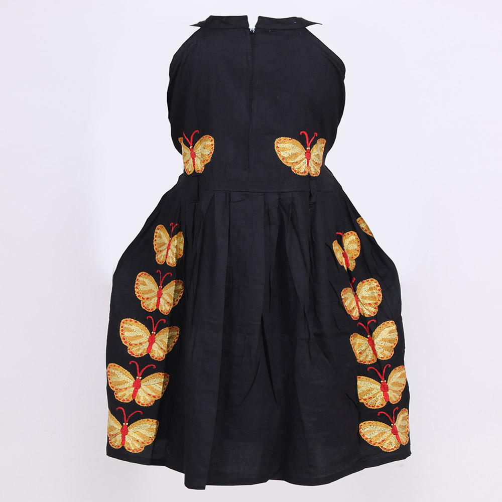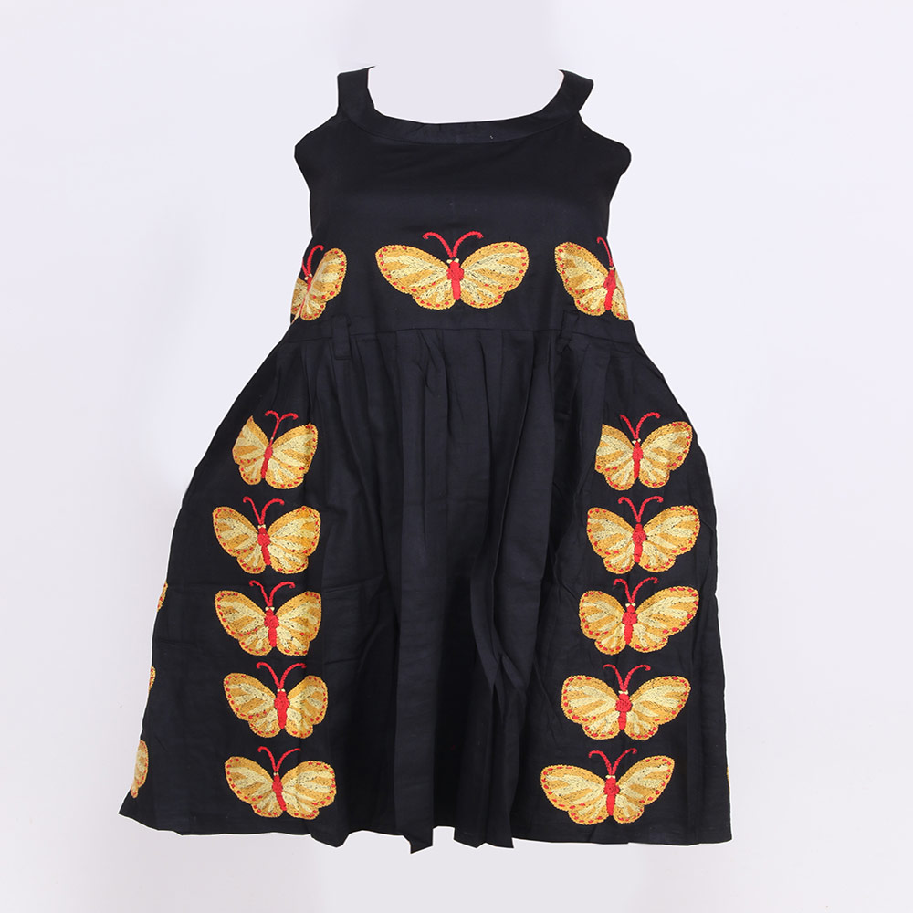 The Frock Is Of Black Colour With Multi Colour Kantha Embroidery