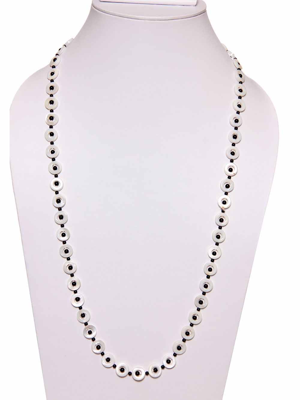 Beautiful & Genuine Onyx And Mother Of Pearl Necklace. Good Quality Semi Precious Gemstone. It Is A Joyful Stone That Feels Very Secure In Its Essence And Transmits The Same Warmth, Protection And Inner Security To Its Surroundings. Handcrafted Fine Onyx Crystal Semi Precious Gemstone Necklace Is Stunning With The Any Dress. Onyx Gemstone Looks Unique In Style. It Complements Your Outfits. Light Weight Necklace Suited For Any Dress And Age. Shape Of Stone: Plain Round Bead, Mother Of Pearl Coin, Size Of Bead: 4mm, Length: Approx 37″, Weight 56 Grams