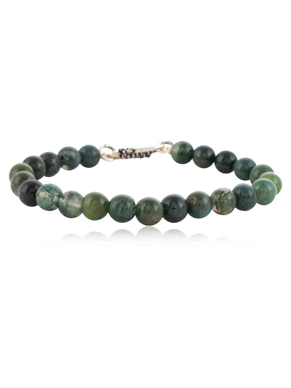 Crystal Campus Moss Agate hand made round bead bracelet is a stone of new beginnings. Refreshes the soul and enables you to see beauty in all you behold. Moss Agate reduces sensitivity to weather and environmental pollutants.