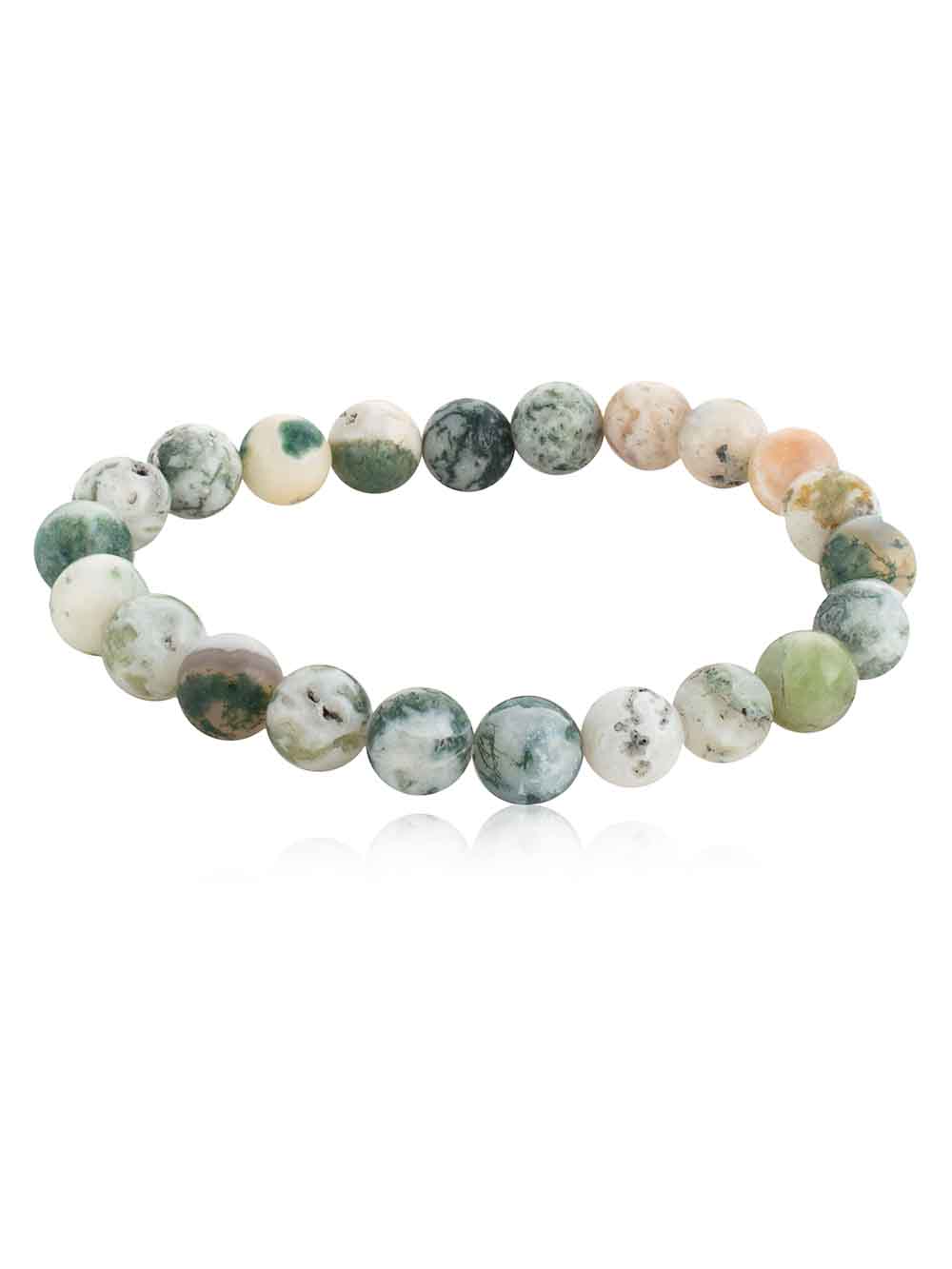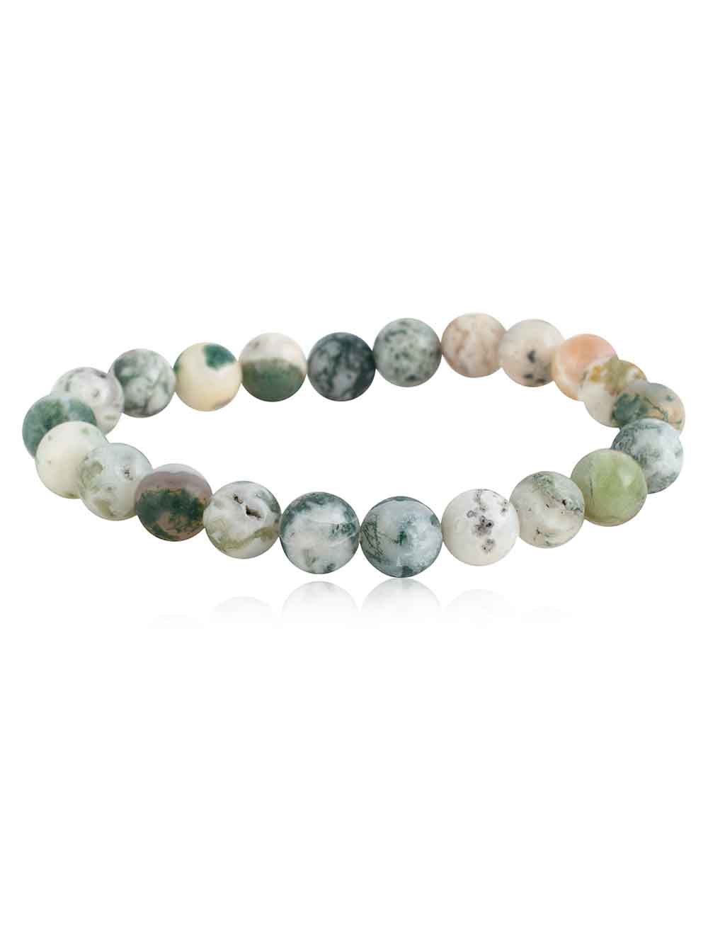 “Crystal Campus Tree Agate hand made stretchable round bead bracelet is a stone of inner peace.  Gentle Tree Agate calms nerves. Tree Agate brings our focus to the oneness of us all, dissolving egoism and arrogance.  Use Tree Agate to ease relationship problems with children. Tree Agate is a highly supportive stone that boosts the immune system and regulates the balance of water in the body. Tree Agate helps to clear energy blockages in the Nadis (energy channels) to allow for a greater flow of this energy throughout the body. By opening up these pathways, Tree Agate can help connect to the natural cycles in life, thereby opening one up to a flow of abundance and prosperity. It will help your body gain physical, emotional, mental, and spiritual strength.