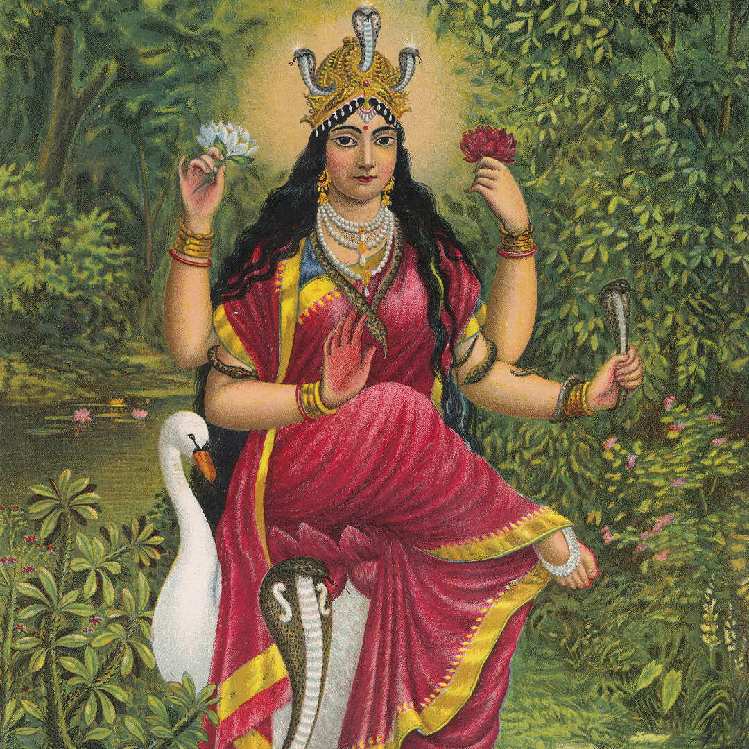 The painting Manasa Devi beautifully captures the essence of the serpent goddess, revered as the deity of snakes, fertility, and healing. Manasa Devi is depicted seated gracefully upon a lotus or surrounded by coiled serpents, symbolizing her dominion over the powers of nature and protection from snakebites. Her calm yet commanding expression reflects both compassion and divine authority. Adorned with golden ornaments and a radiant crown, she holds sacred symbols such as a pot of nectar, a lotus, or snakes in her hands. The background often features rivers and forests, emphasizing her connection to water and life. The artwork exudes serenity, devotion, and the goddess’s protective, nurturing energy.
