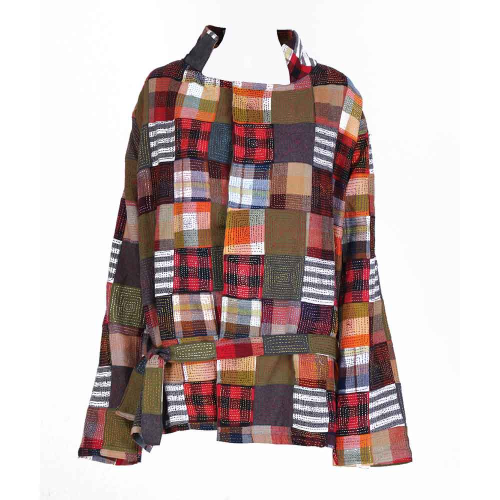 Full Sleeved Patchwork Jacket Fixed With A Belt & Intricate Kantha Design On Each Patch With Matching Thread