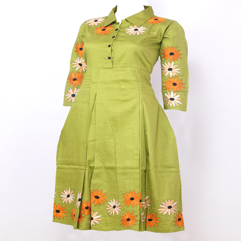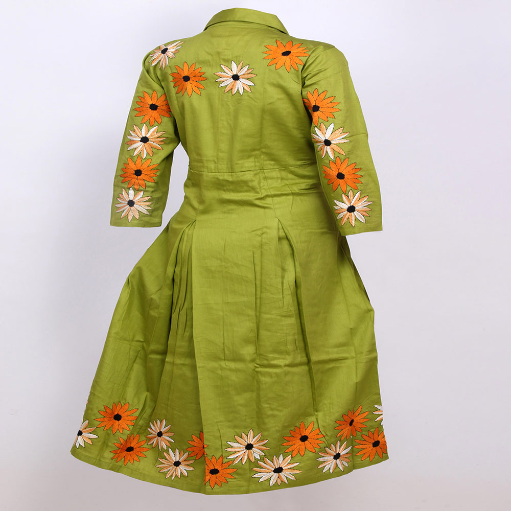 Knee Lenght Full Sleeved Collared Frock Made Of Cotton Silk With Intricate Kantha Design On Front,back & Sleeves