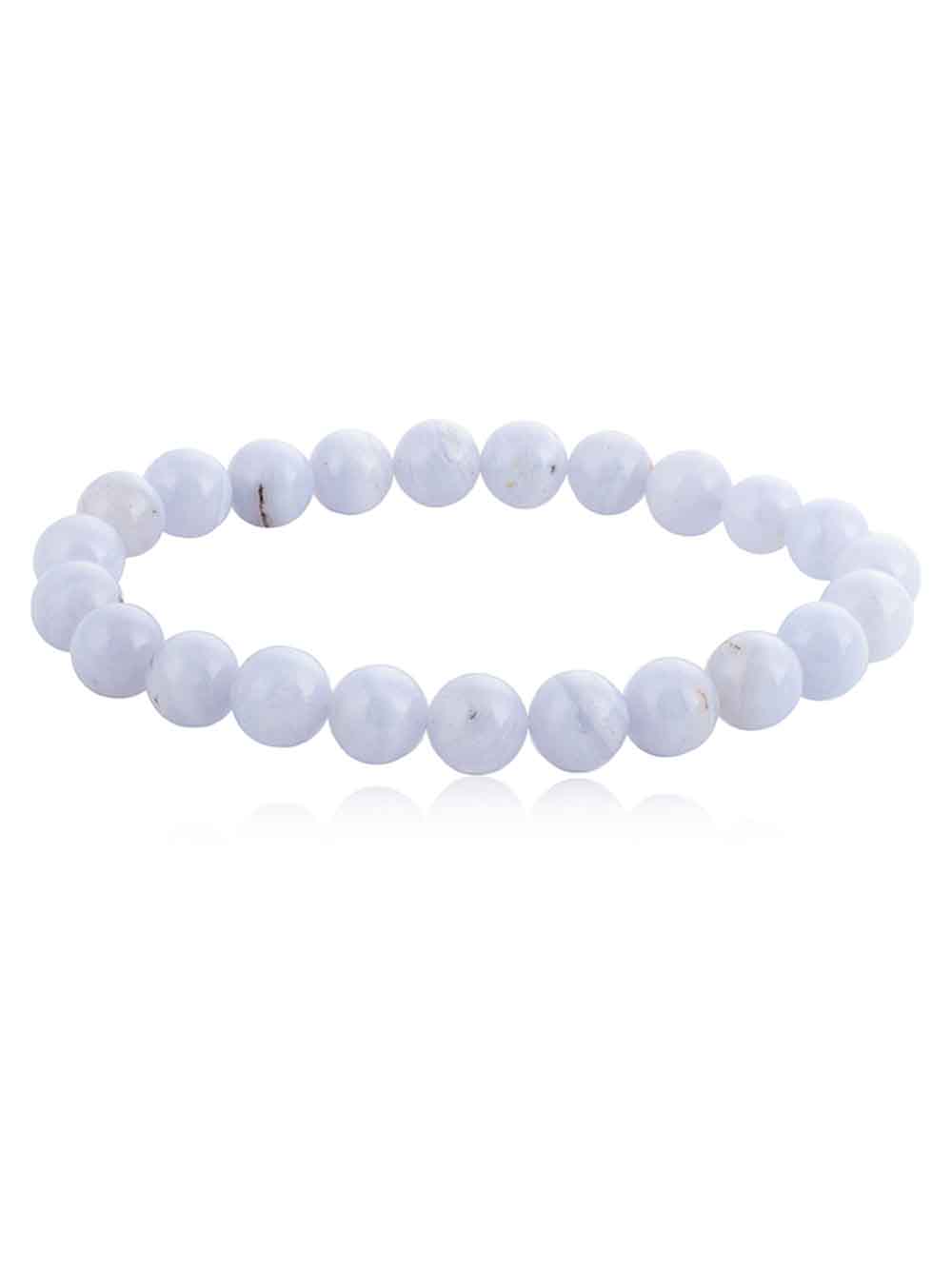 “Crystal Campus Blue Lace Agate hand made stretchable round bead bracelet tranquility. A powerful throat healer, it assists with verbal expression of thoughts and feelings.