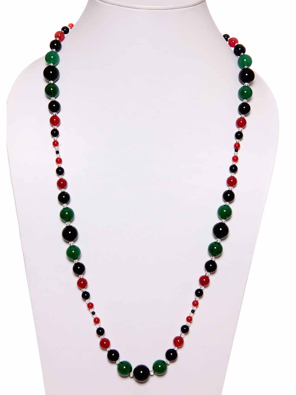 Beautiful & Genuine Multicolor Onyx And Crystal Quartz Necklace. Good Quality Semi Precious Gemstone. It Is A Joyful Stone That Feels Very Secure In Its Essence And Transmits The Same Warmth, Protection And Inner Security To Its Surroundings. Handcrafted Fine Onyx Crystal Semi Precious Gemstone Necklace Is Stunning With The Any Dress. Onyx Gemstone Looks Unique In Style. It Complements Your Outfits. Light Weight Necklace Suited For Any Dress And Age. Shape Of Stone: Plain Round Bead, Size Of Bead: 4, 6, 8, 10, 12, 14 And 16mm, Length: Approx 38″, Weight 142 Grams