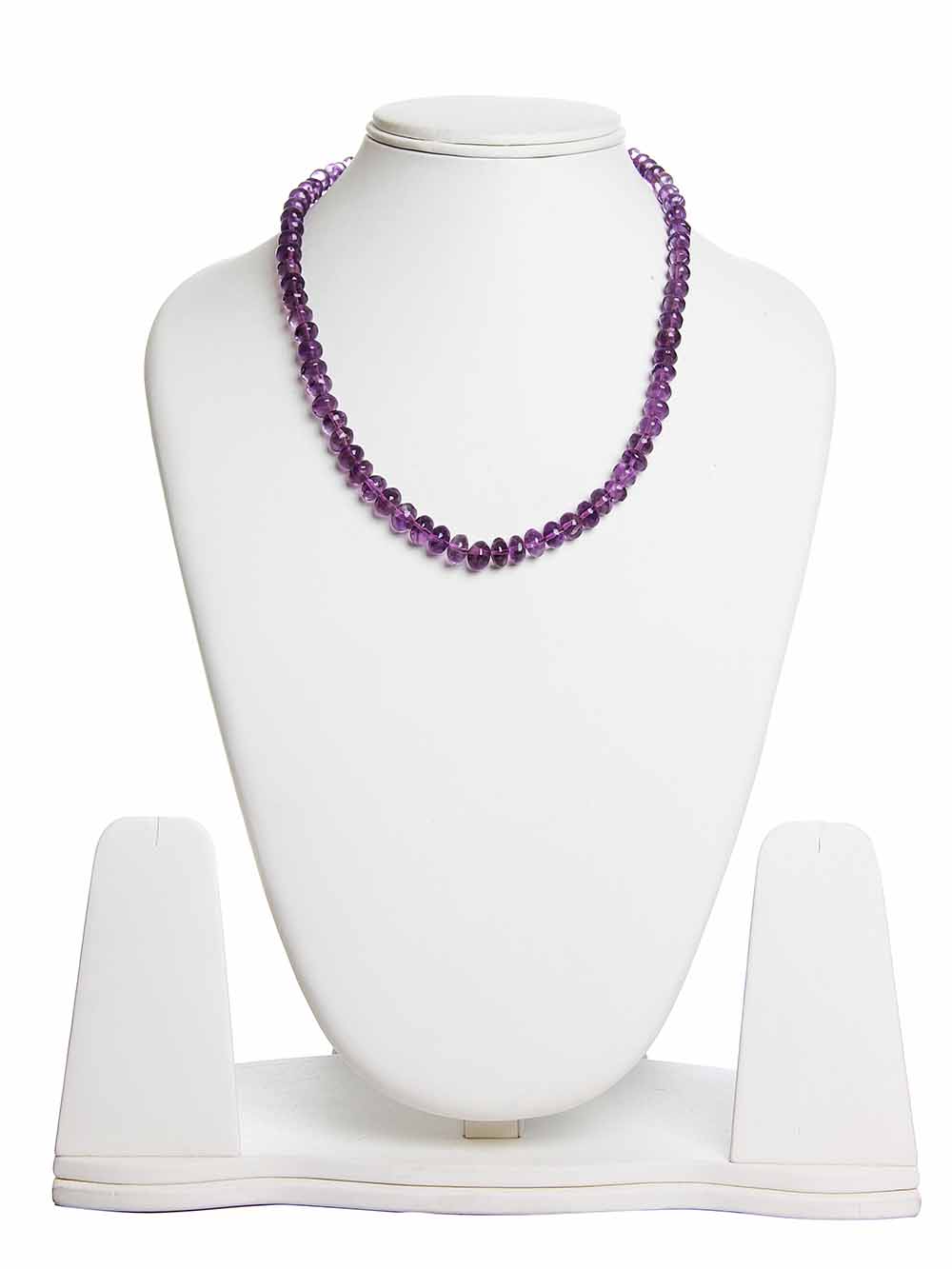 Crystal Campus Semi Precious Amethyst Reiki Crystal Chakra Healing Gemstone Necklace. Amethyst is a powerful and protective stone. It guards against psychic attack, transmuting the energy into love and protecting the wearer from all types of harm, including geopathic or electromagnetic stress and ill wishes from others. Amethyst is a natural tranquilizer, it relieves stress and strain, soothes irritability, balances mood swings, dispels anger, rage, fear and anxiety. Alleviates sadness and grief, and dissolves negativity. Amethyst activates spiritual awareness, opens intuition and enhances psychic abilities. It has strong healing and cleansing powers. Amethyst encourages sobriety, having a sobering effect on overindulgence of alcohol, drugs or other addictions. It calms and stimulates the mind, helping you become more focused, enhancing memory and improving motivation. Amethyst assists in remembering and understanding dreams. It relieves insomnia. Encourages selflessness and spiritual wisdom. Amethyst boosts hormone production, tunes the endocrine system and metabolism. It strengthens the immune system, reduces pain and strengthens the body. It destroys malignant tumors and aids in tissue regeneration. Cleanses the blood. Relieves physical, emotional and psychological pain or stress. Amethyst eases headaches and releases tension. It reduces bruising, swellings, injuries, and treats hearing disorders. Amethyst heals diseases of the lungs and respiratory tract, skin conditions, cellular disorders and diseases of the digestive tract. Size Of Bead: 6.5 * 6.5 mm to 8.5* 6 mm plain roundel , Length: Approx 18″, Weight 85 Grams