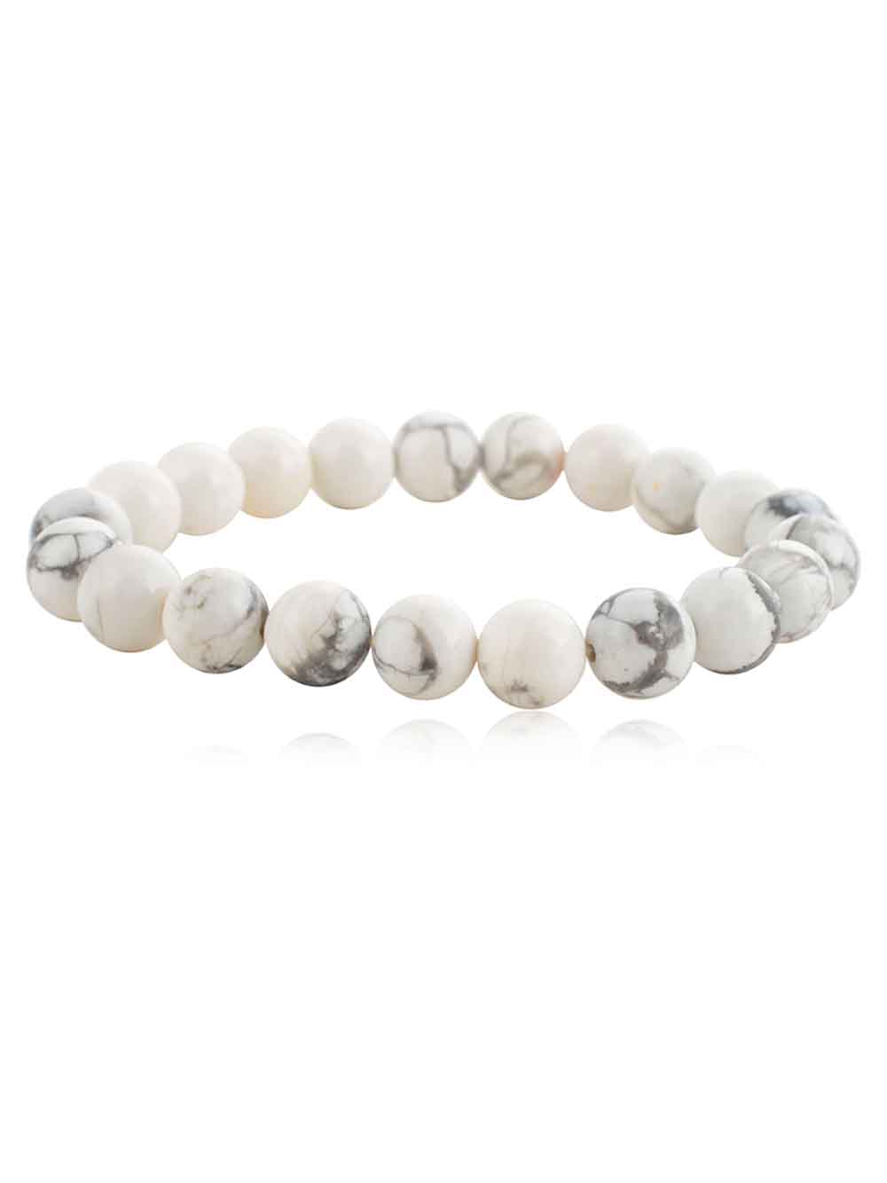 Crystal Campus  Howlite hand made stretchable round bead bracelet is an aid to insomnia, especially when caused by an overactive mind.  Formulates ambitions and aids in achieving them.  Howlite strengthens memory and stimulates desire for knowledge.