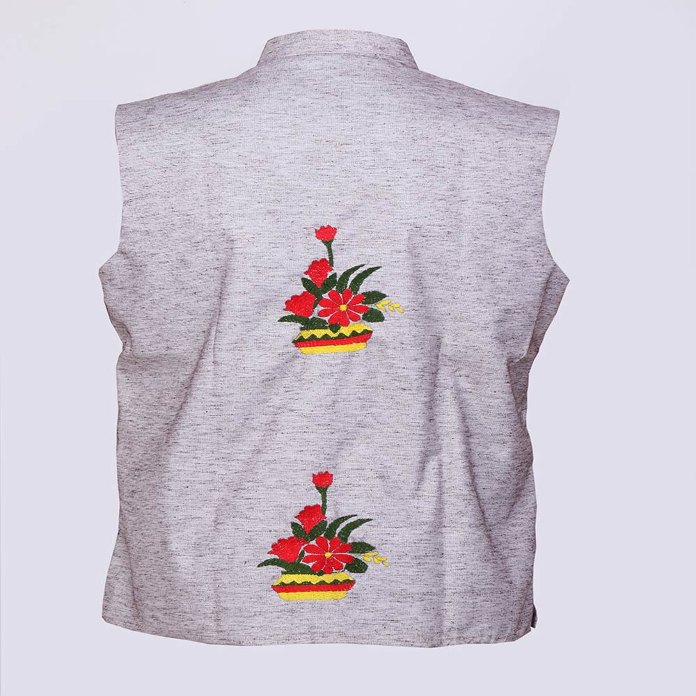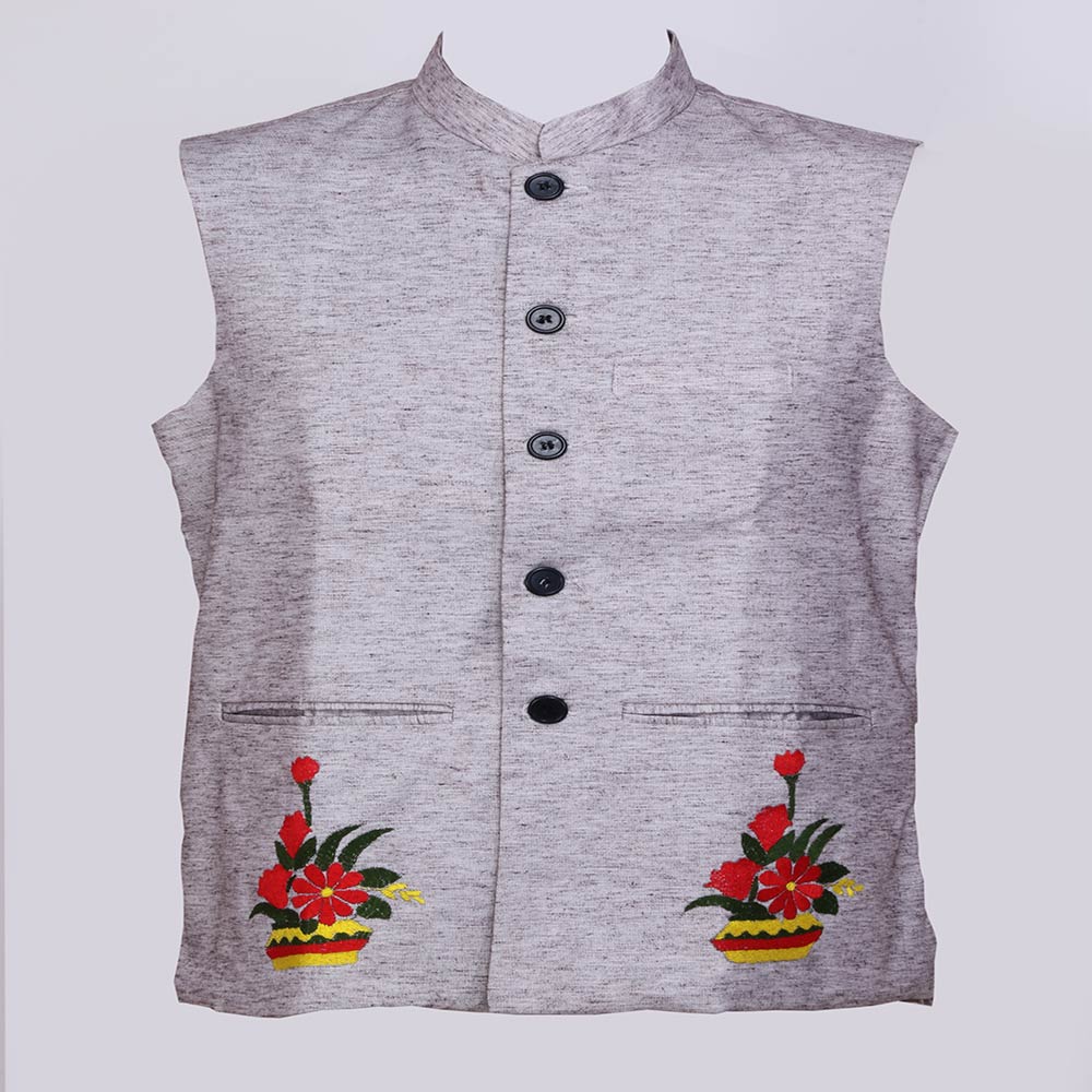 Waistcoat Is Of Grey Colour With Multi Coloured Thread Embroidery.