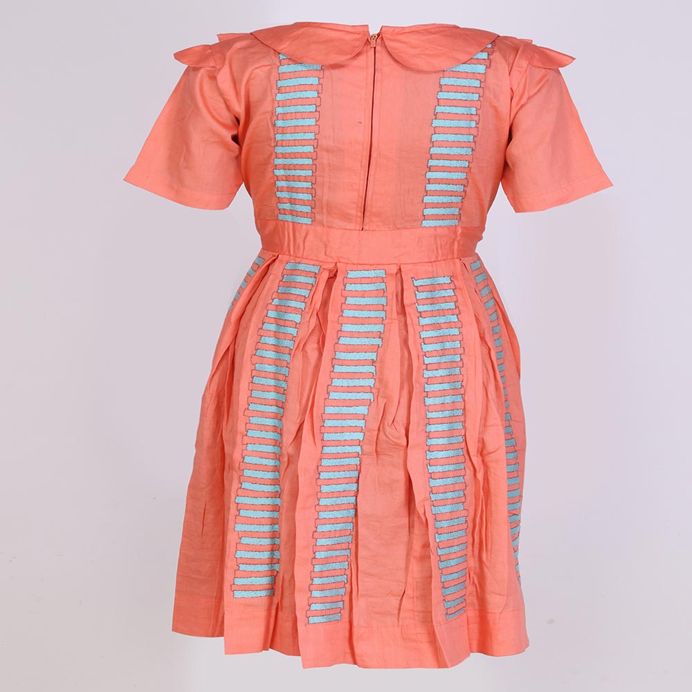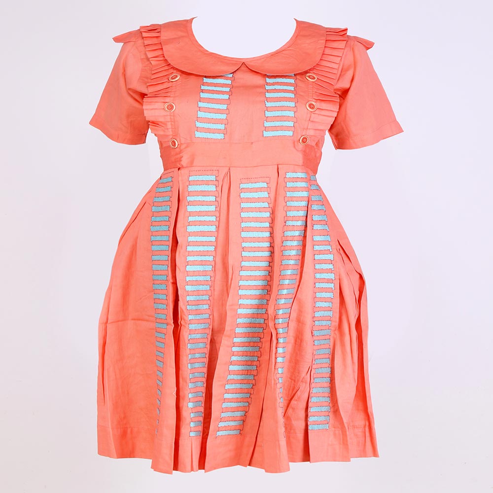 The Frock Is Of Coral Colour With Multi Colour Kantha Embroidery