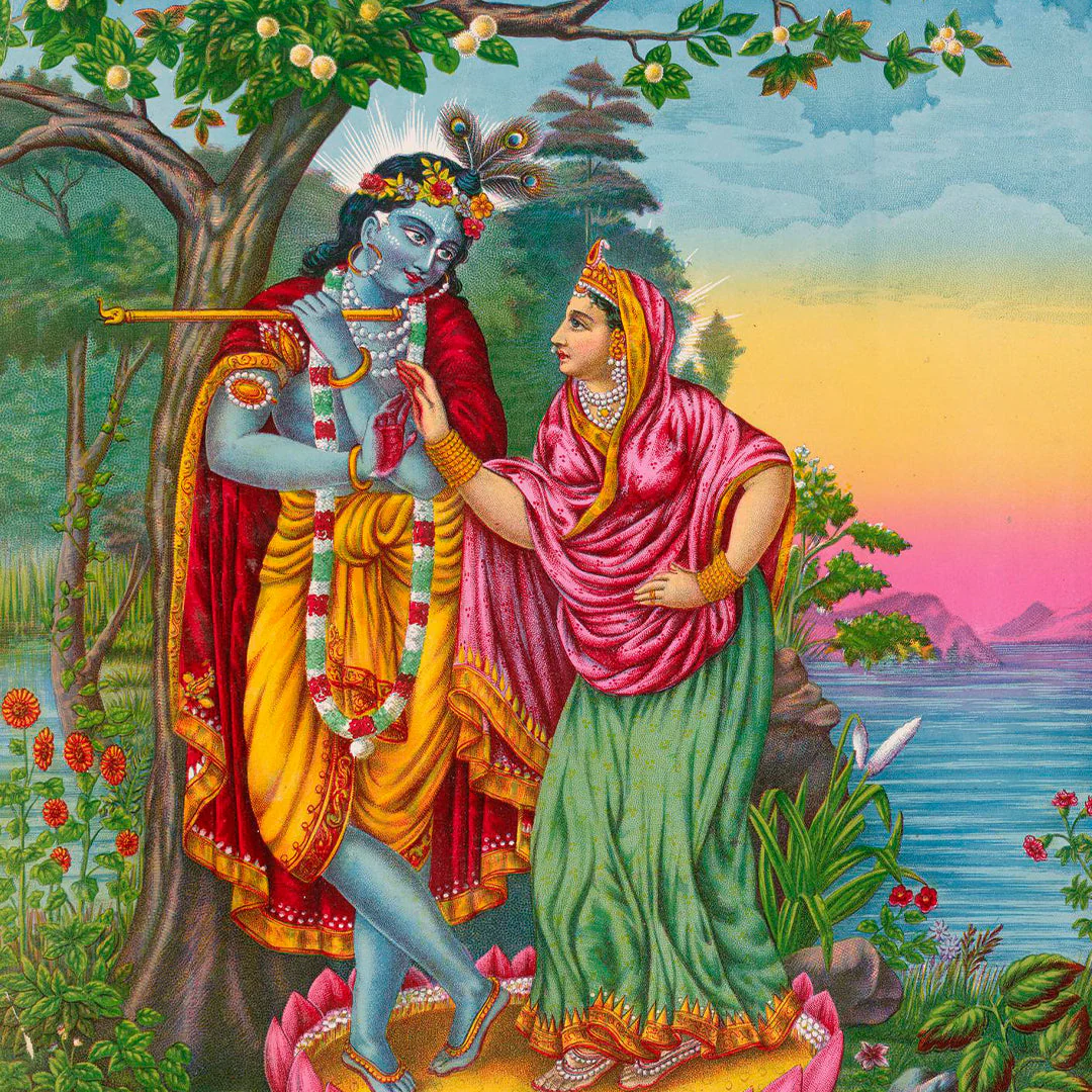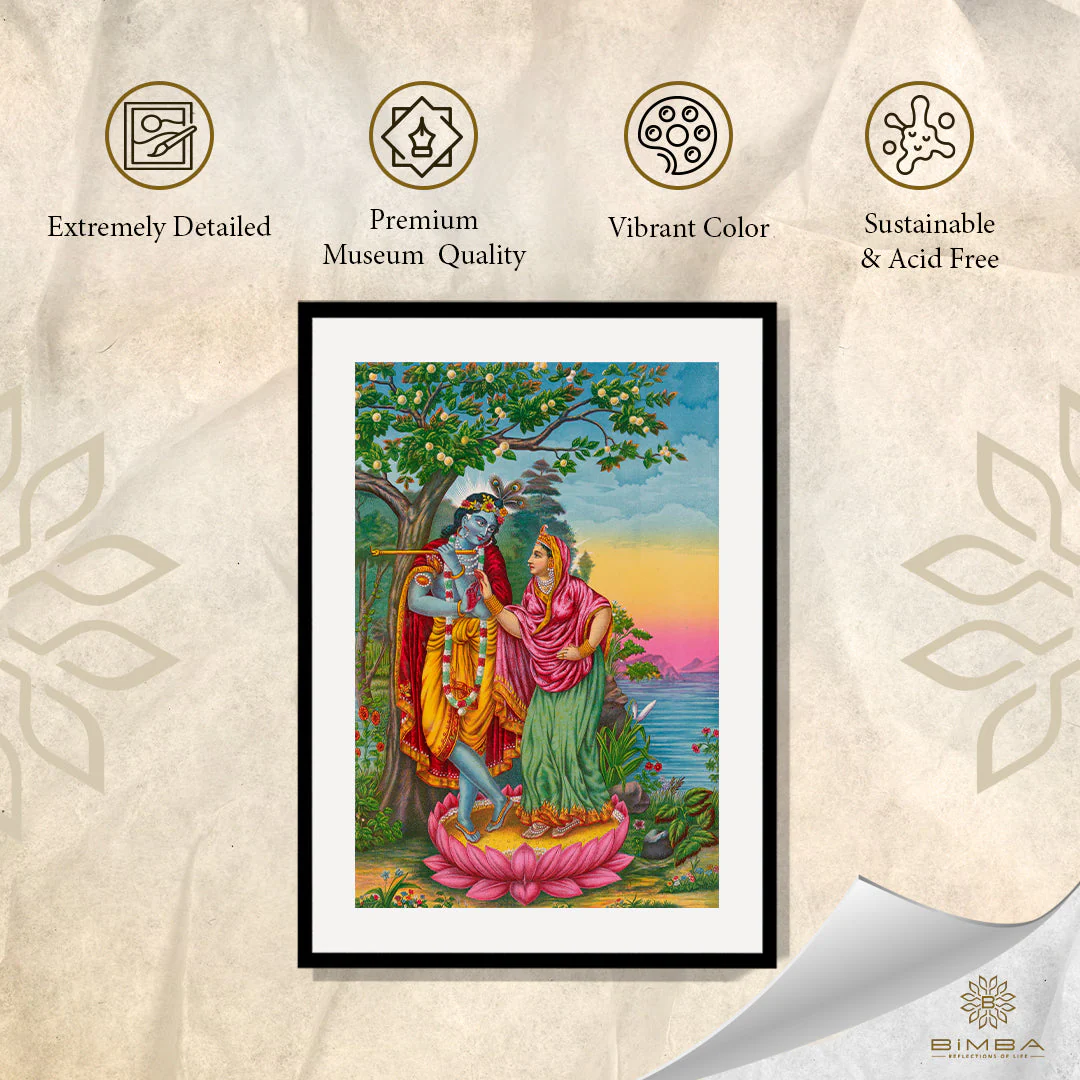 The painting depicts the divine couple, Radha and Krishna, in a moment of serene connection. Radha, the symbol of devotion, is shown with grace and beauty, her expression filled with love and longing for Krishna. Krishna, the playful and enchanting god, stands beside her, playing his flute, creating an aura of divine music and harmony. The background is often filled with lush greenery and tranquil rivers, enhancing the ethereal nature of their bond. The soft colors, flowing robes, and intricate details in the painting evoke a sense of spiritual beauty, symbolizing eternal love, devotion, and the deep connection between the divine and the devotee.