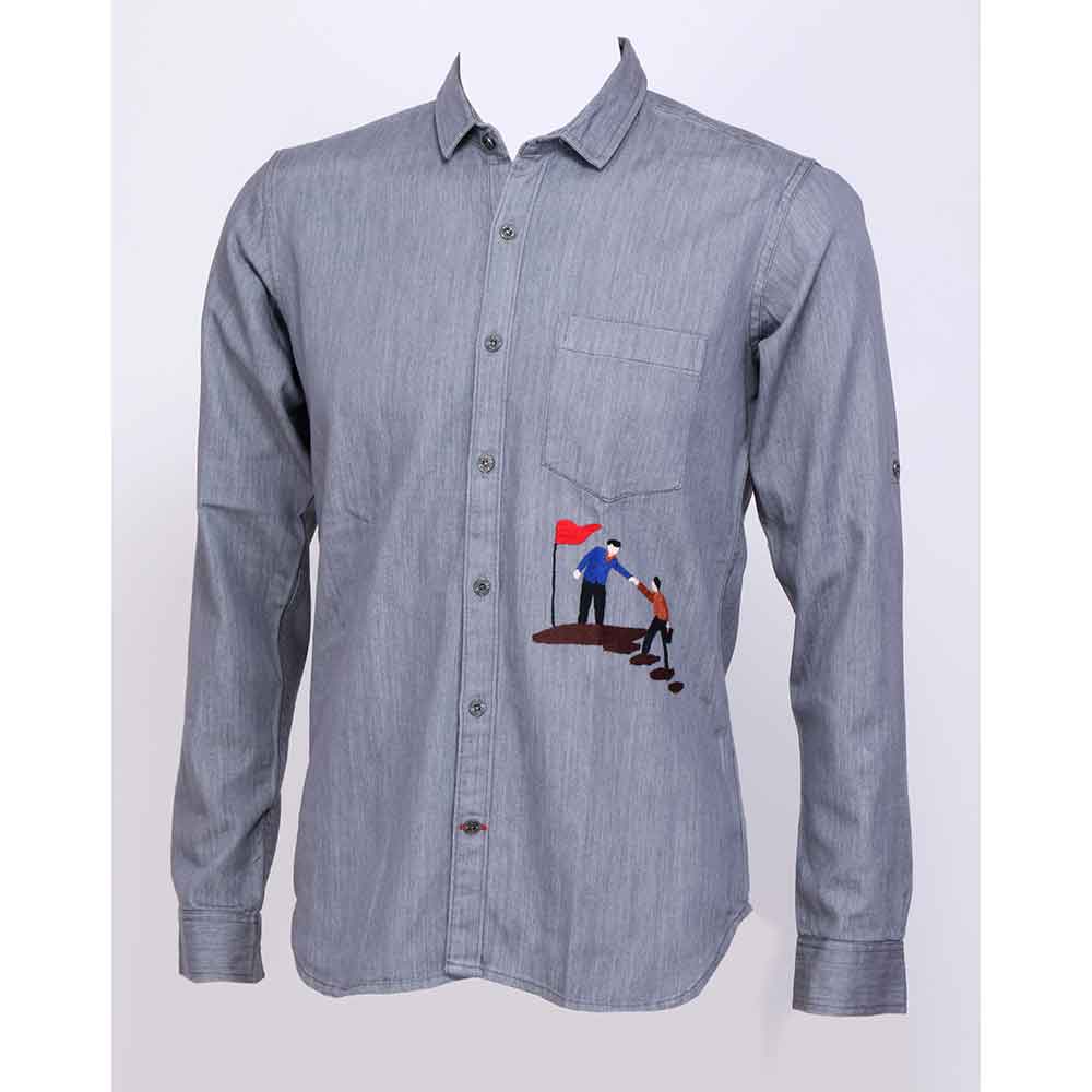 Full Sleeve Collared Blue Denim Shirt With Kantha Embroidery Done.the